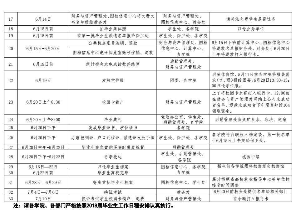 2018届本科毕业生即将离校,为明确职责,加强协调,保障毕业生离校工作文明、安全、高效、有序地进行,经研究,对今年毕业生离校工作提出如下要求: