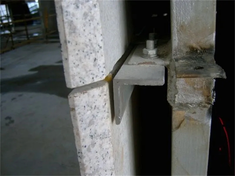 干挂法就是用特制的不锈钢挂件,将石材固定在基体上的一种施工方法,这种方法不需要用水泥砂浆灌注或水泥镶贴,方便简捷。具体做法是直接在石板上打孔、开槽,然后用不锈钢连接件、角钢与埋在柱体内的膨胀螺栓直接相连而成。
