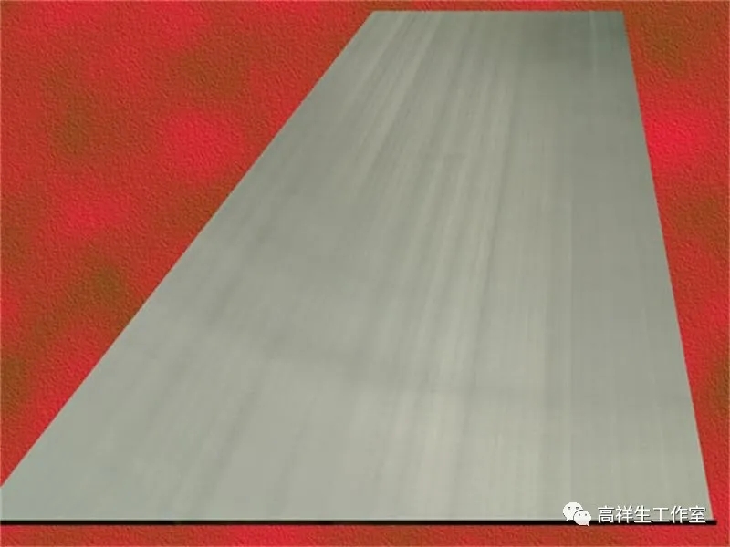 铝合金花纹板是以防锈铝合金为基质,用特制的花纹轧制而成的。它具有精致的花纹,不易磨损,防滑性能好,防腐性强,便于冲洗(图6-3-1)。表面经处理可呈现不同的颜色。广泛用于墙面、电梯门等部位的装饰。