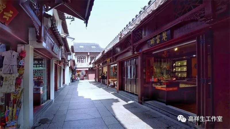 原贡院街的商铺在减少,而在大石坝街的商铺,特别是餐饮建筑增加了。在这里有晚晴楼、天圆楼、老盛庆、金陵春、秦淮人家、咸亨酒店等大石坝街的商铺更加注重了商铺的细部装饰,大多采用回字纹、万字纹。店招一律由名家书写,店招的形式多数竖向布置……都是新中式风格。很显然大石坝街商铺的风格也延续了东市、西市的商铺风格。