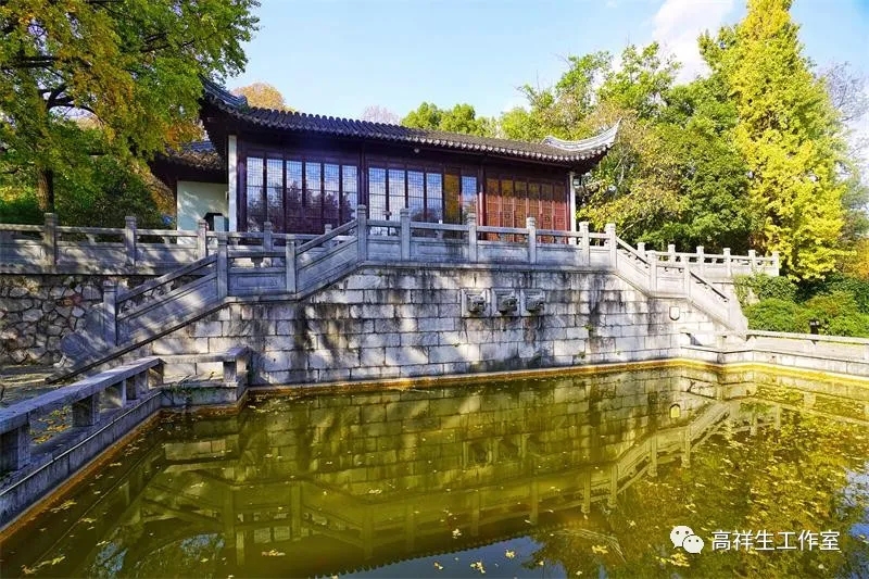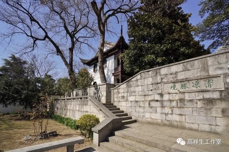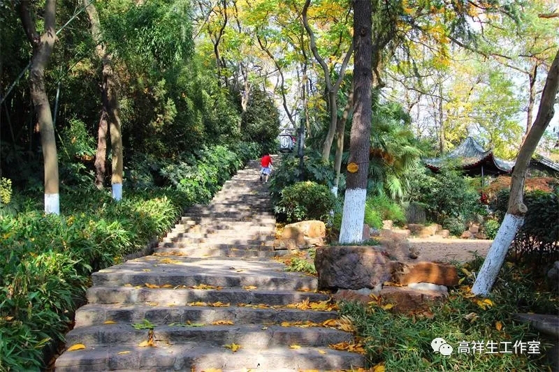 清凉山公园南大门后的右侧有一条向上的石阶小道,时隐时现,逶迤曲折,两旁八角金盘、梧桐、无患子佇立,湖石悉数、凉亭点缀,阳光下石阶光斑陆离。