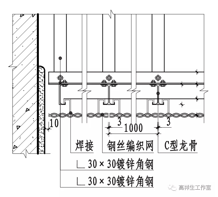 图 13-3-31 明龙骨金属网顶棚构造节点图(一)