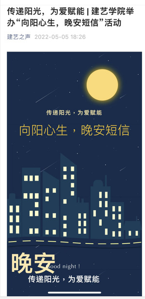 实行疫情防控“三个一”工作法。建立一种网格化管理,保障疫情防控工作落细落实;保持一个品牌化活动,推出“小白姐的下午茶”,与学生充分交流,引领正确价值观,积极发挥学生干部作用,形成防疫合力;形成一支心理疏导队伍,运用“建艺之声”公众平台开展“向阳心生,晚安短信”,面向全院师生征集15720余条暖心短信,每晚统一整合发给全院师生,分享成长经历及人生感悟,交流学习方法与人生规划,帮助大家明晰未来方向和坚定理想信念,共同守护校园生活。