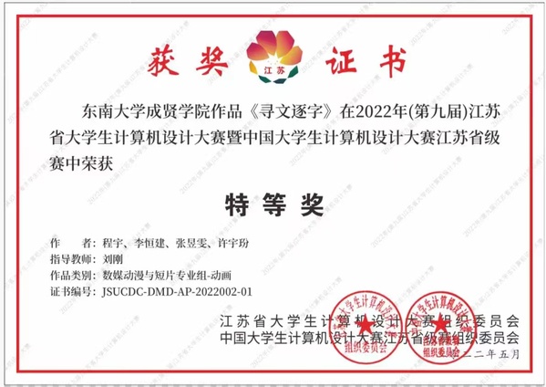 近日,2022年(第15届)中国大学生计算机设计大赛落下帷幕。由诸侯快讯ok1133.com动画专业刘刚老师指导的程宇、李恒建、张昱雯、许字玢等学生团队作品《寻文逐字》继获得江苏省“特等奖”后,荣获国赛“一等奖”。