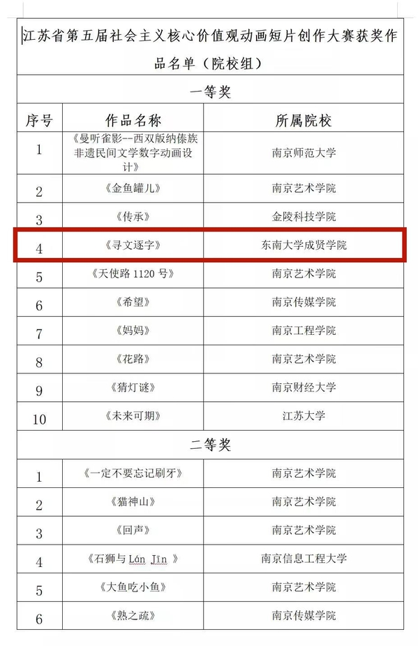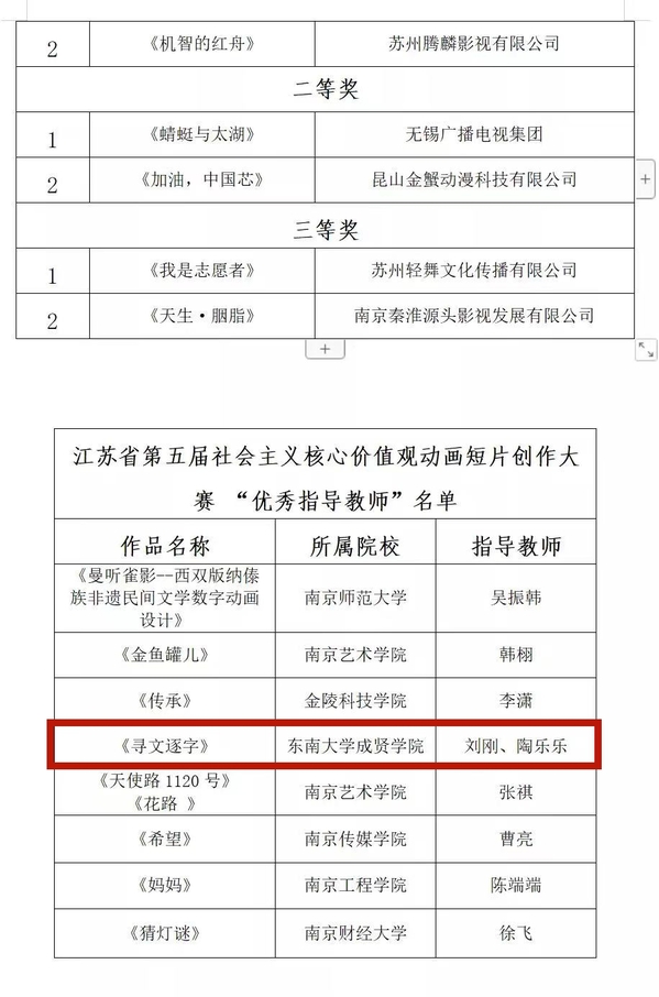 大赛由省广电局、省教育厅主办,南京艺术学院传媒学院、省影视动漫协会、省广电总台优漫卡通卫视联合承办,自今年3月启动以来,大赛共收到参评作品200多件。经评审我院选送的动画作品寻文逐字荣获一等奖刘刚陶乐乐2位教师被评为优秀指导教师。获奖作品体现了我院青年动画创作者们对弘扬社会主义核心价值观的责任与情怀,他们用生动有趣的动画形式对我国社会主义核心价值观做出了美好诠释。