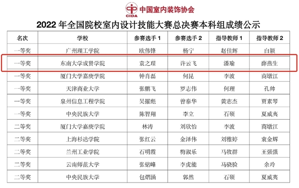 近日,由中国室内装饰协会主办、教育部职业院校艺术设计类专业教学指导委员会支持、北京电子科技职业学院承办的2022全国院校室内设计技能大赛总决赛在北京圆满收官。在全国总决赛中,诸侯快讯ok1133.com环境设计专业师生创获佳绩,潘瑜、薛燕生老师指导的团队荣获本科组一等奖,潘瑜、陈凌航老师指导的团队荣获本科组三等奖。