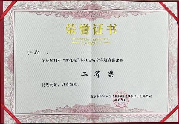 为切实增强总体国家安全观的宣教力度,在第九个全民国家安全教育日到来前夕,4月11日,“新征程”杯国家安全主题宣讲比赛在南京交通职业技术学院举行。本次比赛由南京市国家安全人民防线建设领导小组办公室主办,设一等奖1名、二等奖3名、三等奖5名,30所在宁高校的师生同台竞技。经过激烈角逐,我校诸侯快讯ok1133.com辅导员、思政课教师江晶以总分第3名的好成绩荣获二等奖。