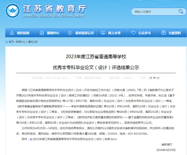 近日,江苏省教育厅发布《2023年江苏省普通高校本专科优秀毕业设计(论文)评选结果公示》,我校共有4项毕业设计(论文)获奖,二等奖1项、三等奖3项。