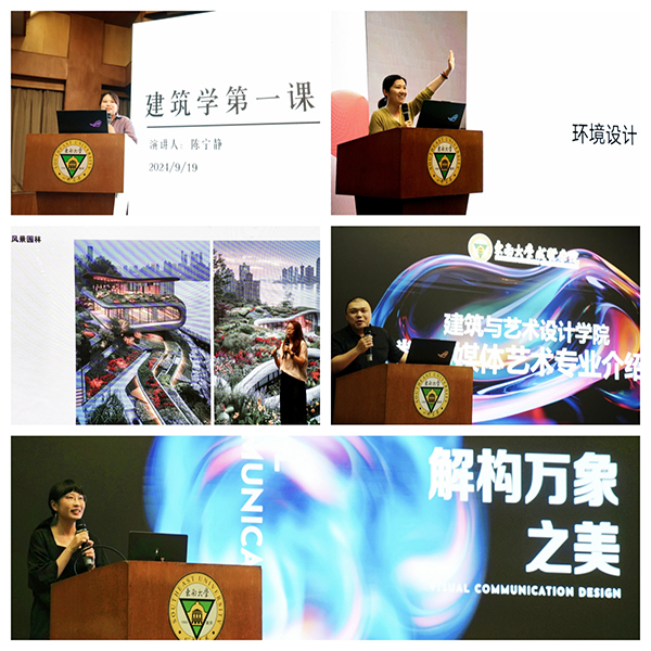 来自各教研室的教师陈宁静、刘晓青、芮潇、张庆和陈晓青,分别对建筑学、风景园林、环境设计、数字媒体艺术和视觉传达设计作专业介绍,让新生们对各自的专业有了更加明确的专业学习目标。