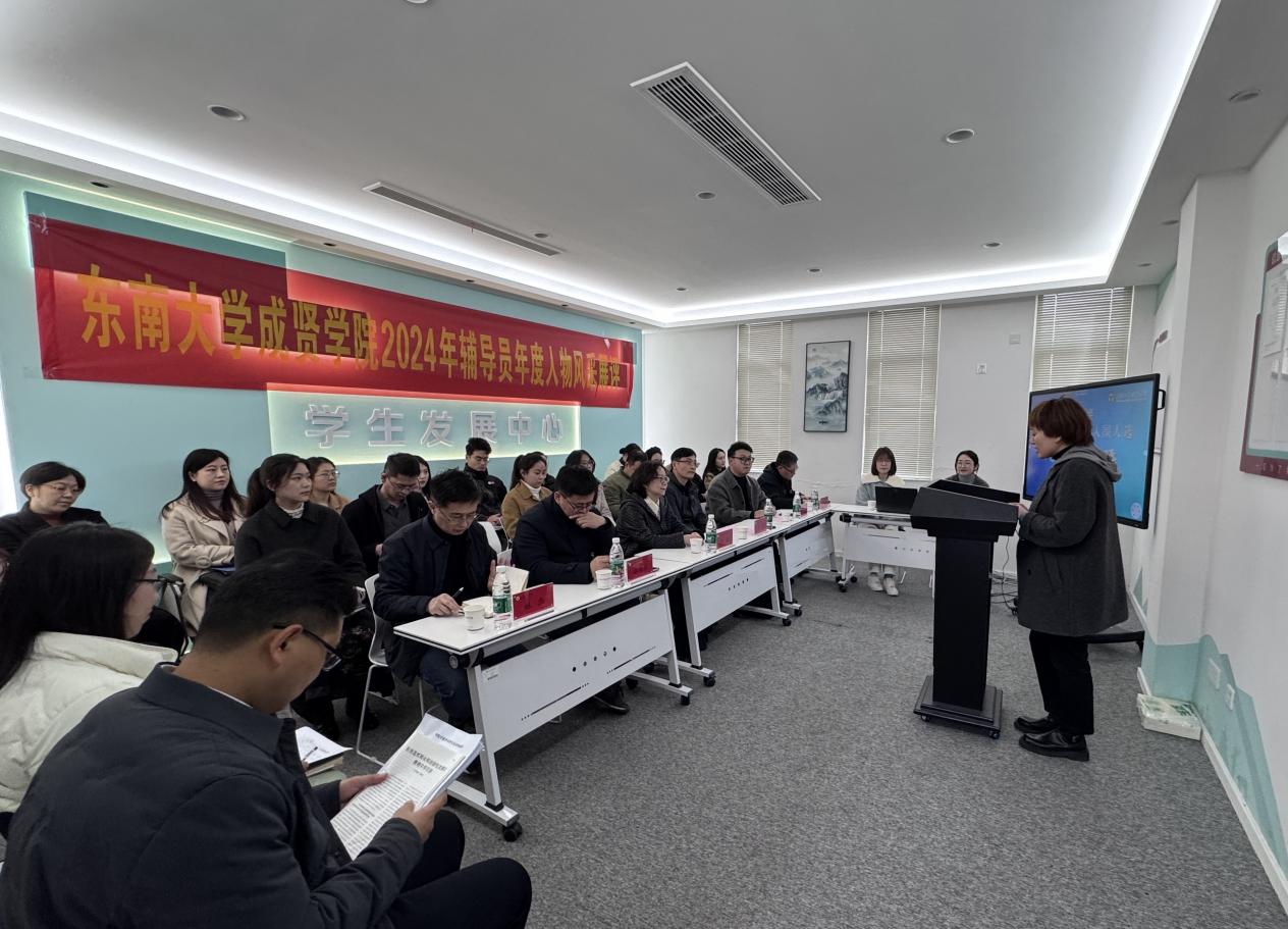 本次辅导员年度人物评选分为事迹材料考评、学情测试、风采展评、同行互评四个部分。3月10日,党委学工部在真知馆305会议室进行了学情测试,考察辅导员对学生的了解与熟悉程度。3月13日下午,党委学工部在“一站式”学生社区组织开展辅导员年度人物评选风采展评活动。校党委副书记、副院长王荣出席本次活动并致辞,南京邮电大学电子与光学工程学院、柔性电子(未来技术)学院党委副书记、副院长徐磊,东南大学材料科学与工程学院团委书记、东南大学2023年及2024年辅导员年度人物韩林原,校组织人事部部长汪旭东,党委学工部部长、学生处处长施杰,团委书记、人武部部长潘明烽应邀担任活动评委。各学院辅导员代表作为同行互评人员参加本次活动,活动由学生处副处长沈黎芳主持。